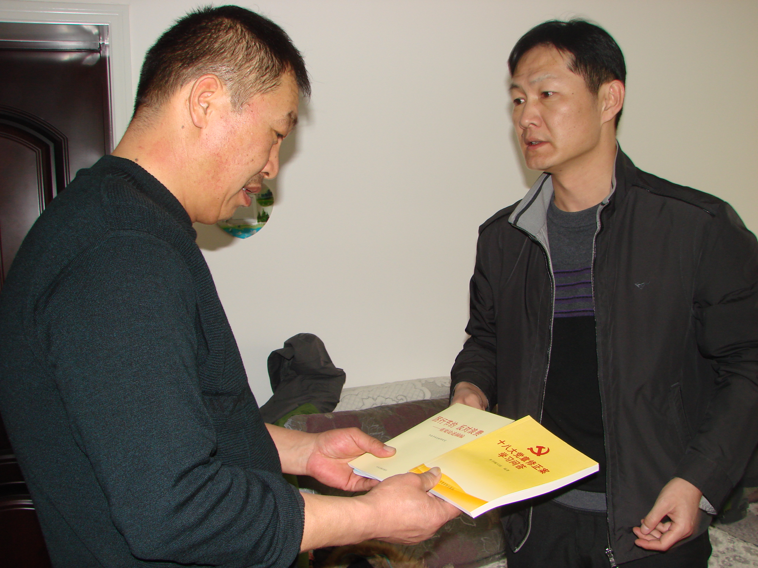 圖為電安公司教育實(shí)踐活動(dòng)領(lǐng)導小組組長(cháng)襲著(zhù)楓把關(guān)于開(kāi)展黨的群眾路線(xiàn)教育實(shí)踐活動(dòng)學(xué)習的書(shū)籍送到黨員孔勝利的手中