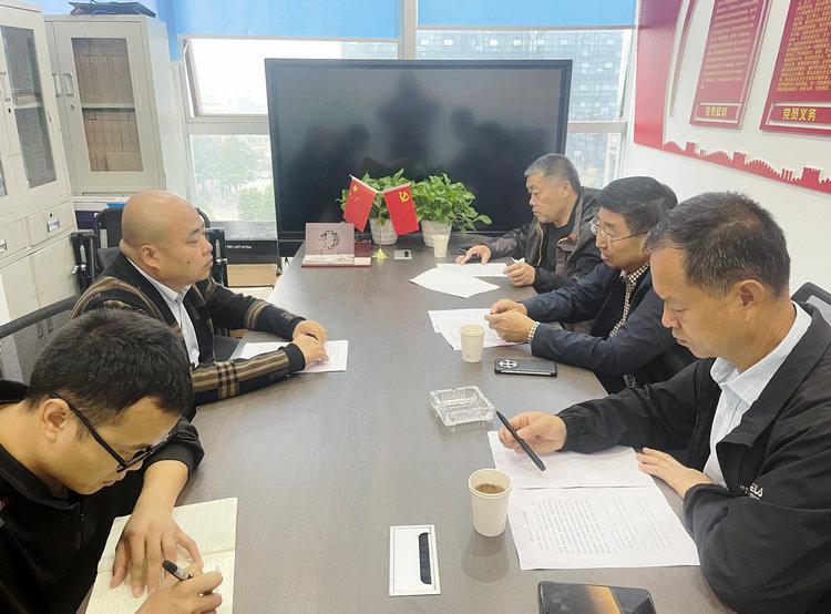 在會(huì )議室,調研組一行聽(tīng)取了四川分公司經(jīng)理屈戶(hù)選對分公司目前在建工程的基本情況匯報??隙朔止窘衲暝谑袌?chǎng)開(kāi)拓做出的成績(jì),也為分公司遇到的難點(diǎn)問(wèn)題提出了建議。
