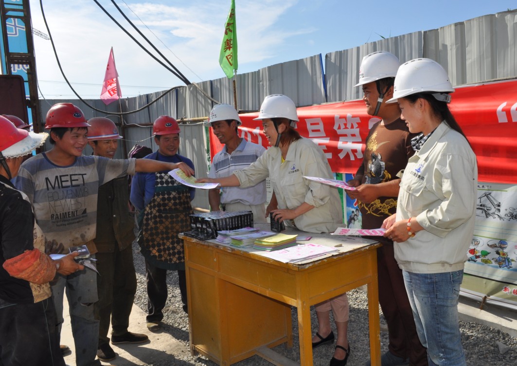 圖為公司計生辦副會(huì )長(cháng)李琦在208項目現場(chǎng)發(fā)放計劃生育宣傳冊