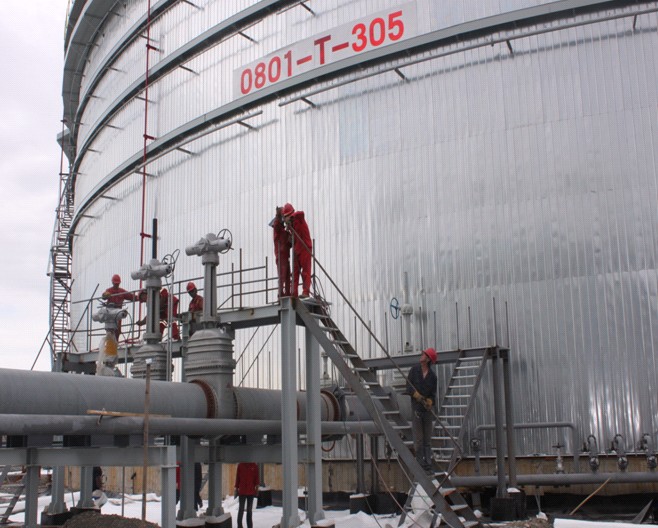 安裝工人正在國家石油儲備基地300萬(wàn)方原油計量間項目加班加點(diǎn)的進(jìn)行80多噸鋼結構、4000多平方彩鋼板和玻璃絲棉的安裝。(葉兆英)